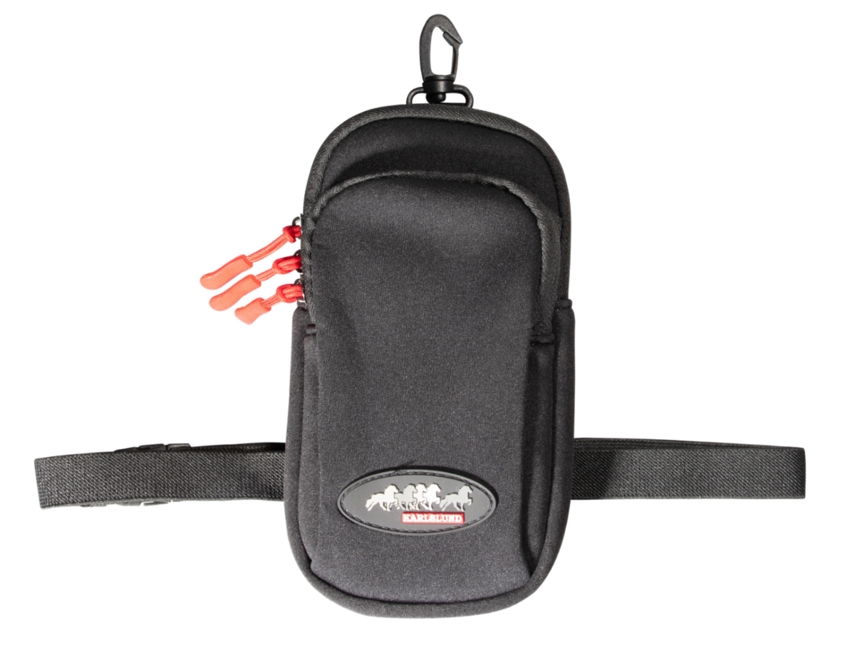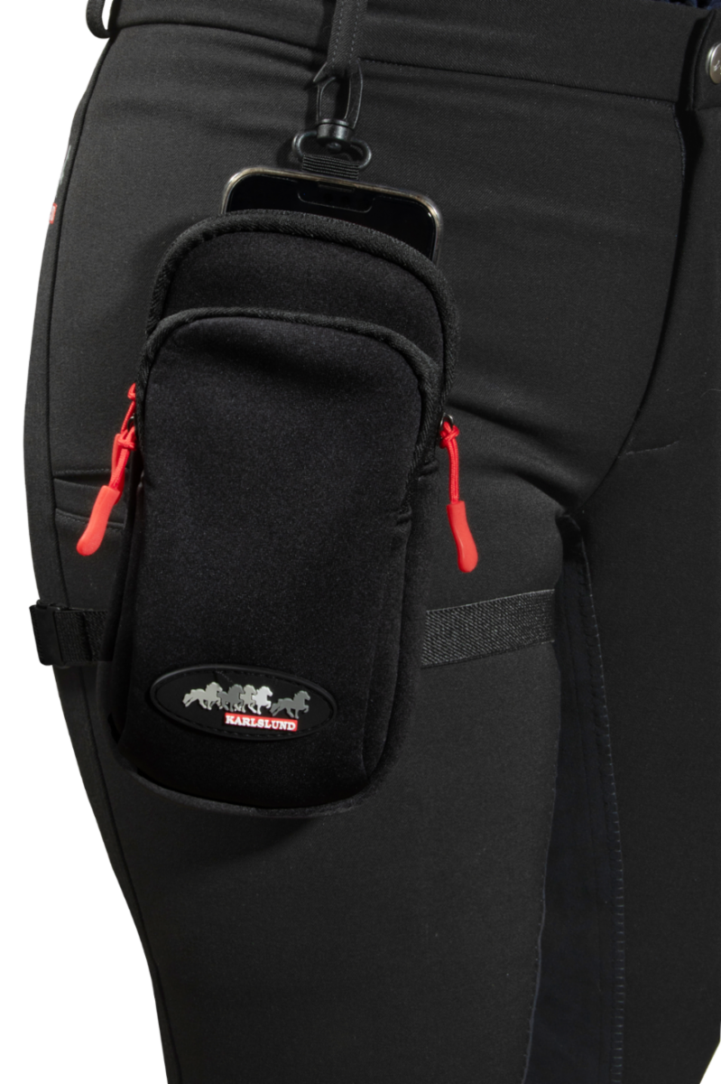 Snygg telefonväska att hänga i bältet och med elastisk benrem för bra stabilitet under ridning. Två fack för telefon, nycklar, hästgodis etc. Tillverkad av vattentätt material med vattenavvisande sömmar och dragkedjor.