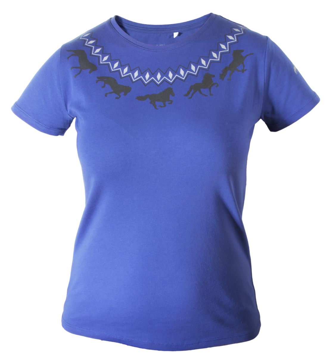 T-shirt med Islandsinspirerat tryck fram och bak på tröjan. Mönstret innehåller fem hästar i gångarterna skritt, trav, tölt, galopp och pass.