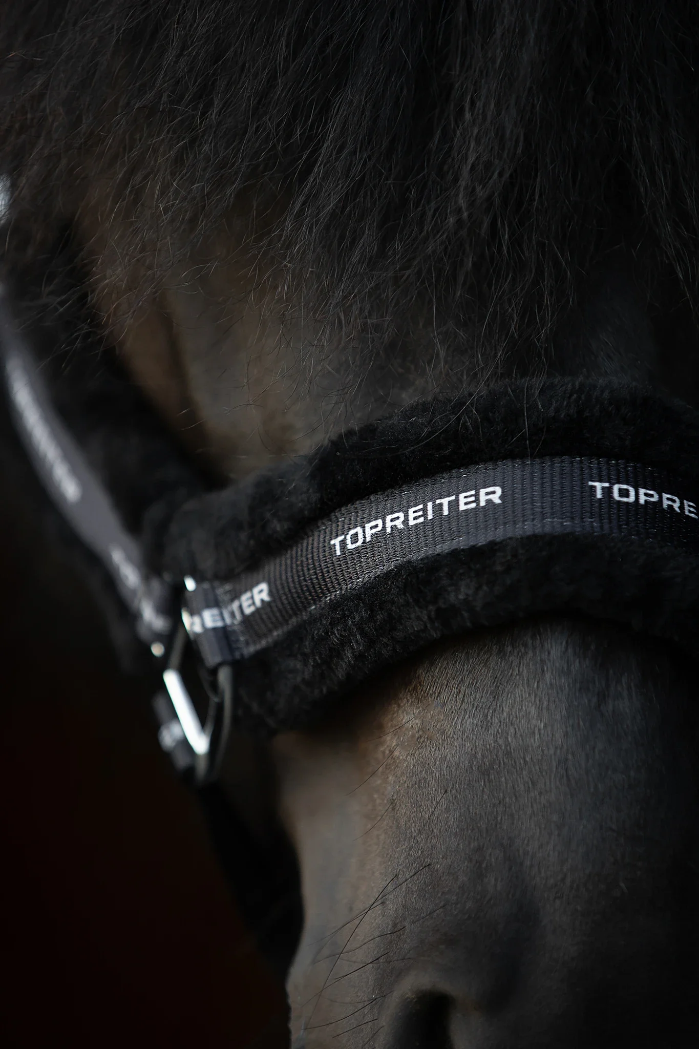 Komplett grimset med mjukt pälsvadderad nylon grimma från populära Islandshästspecialisterna Top Reiter. Grimskaft med säkerhetskarbin. Justerbart nackstycke samt kring mulen Extra ”päls” vadderad över nosryggen...