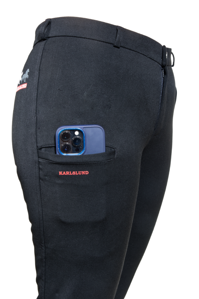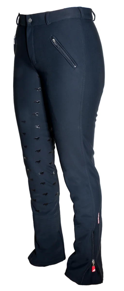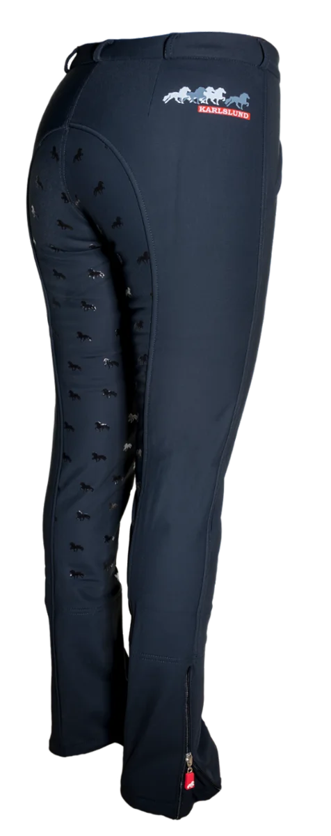 Silikon trycket med ett motiv av Islandshästar i tölt ger optimalt grepp i sadeln, medan blixtlåset på baksidan av vaden ger extra plats för stövlar under byxorna. Tyget är mycket elastiskt, vilket ger en utmärkt passform och maximal rörelsefrihet. Det är hållbart och har en borstad insida som känns härligt mjuk mot huden. Unisexmodell, finns i både normal och extra lång benlängd.