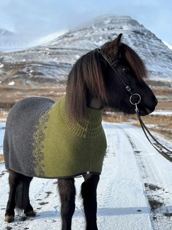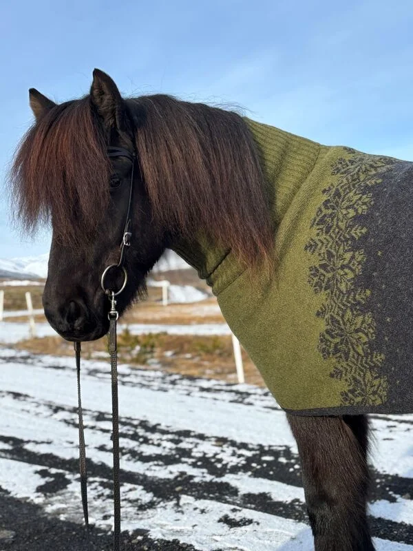 Vackert och funktionellt stickat ulltäcke med hals och polofunktion (Turtleneck). Tillverkat av 100% isländsk ull. Ulltäcket är ett vackert, naturligt alternativ till fleecetäcken och definitivt ett riktigt blickfång! Detta unika täcke har utvecklats i samarbete med Olil Amble och Rúna Einarsdóttir. De utmärkta egenskaperna hos isländsk ull gör detta polotäcke till det perfekta svett och vardagstäcket. Den isländska ullen håller hästen varm när det är kallt ute och torr när det är blött.