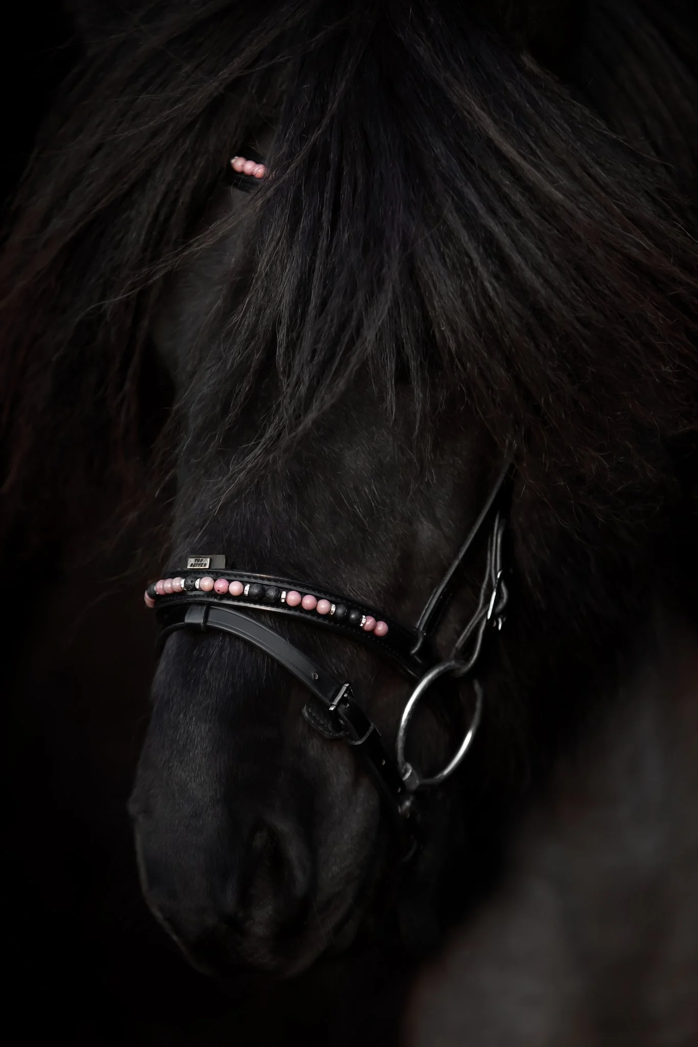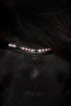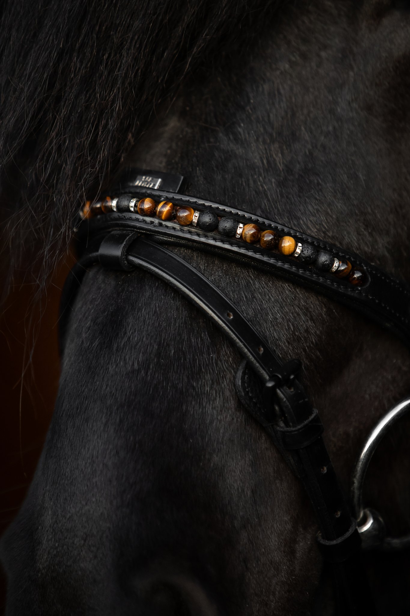 En premium engelsk nosgrimma med avtagbar hakrem, tillverkad av mjukt, djupsvart läder – designad för ryttare som värdesätter elegans, komfort och en förfinad kontakt med sin häst. Dekorerad med Eye-stenar, lavapärlor och fina kristallringar ger den ett varmt, uttrycksfullt utseende som blandar naturliga toner med tidlös stil. Tiger Eye har vackra gyllene till ljusbruna nyanser och är känd för sina lugnande och skyddande egenskaper – perfekt för ryttare som söker balans, klarhet och fokus i sitt arbete med hästen. Lavapärlorna ger en touch av isländsk karaktär och symboliserar styrka, jordning och motståndskraft. Svarta spännen och den subtila Topreiter-logotypen kompletterar den diskreta, eleganta designen. Det mjuka, smidiga lädret säkerställer utmärkt komfort och en hästvänlig passform. En snygg uppgradering för alla träns – tidlöst, elegant och funktionellt.