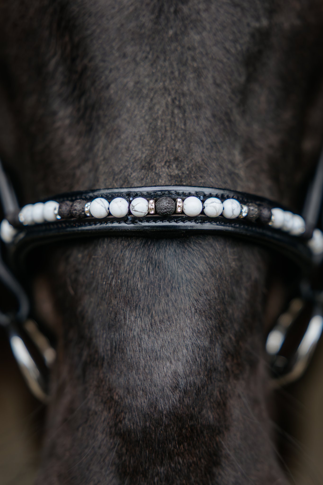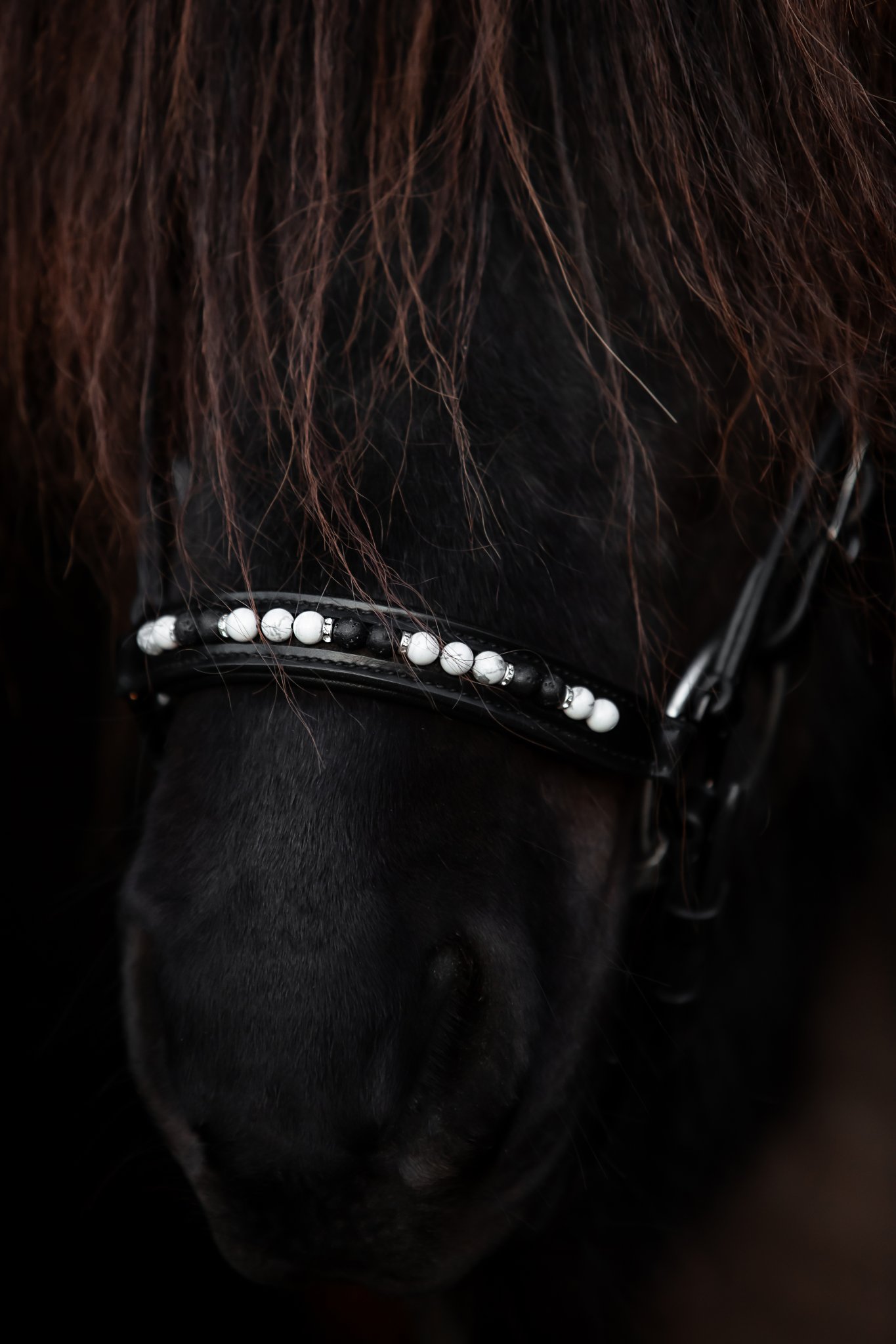 Det mjuka och förstklassiga lädret, i kombination med de svarta spännena och Top Reiter-logotypen, ger nosgrimman en tidlös och diskret design. Detta kompletterar huvudet på varje häst och säkerställer maximal komfort. Enkelheten i nosgrimmans design, tillsammans med den harmoniska kombinationen av lavapärlor, tigerögonstenar och kristallaccenter, gör den till det perfekta valet för alla ryttare som vill lägga till eleganta och tidlösa detaljer till sitt träns.