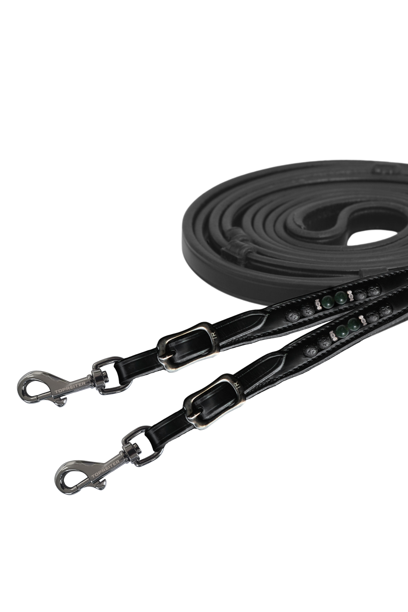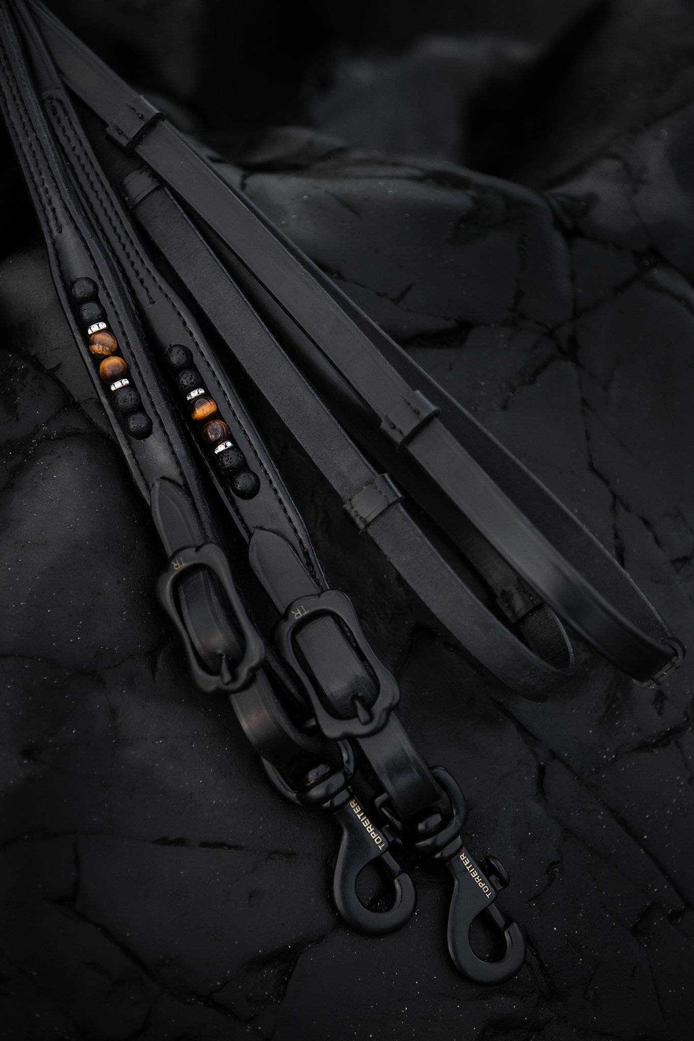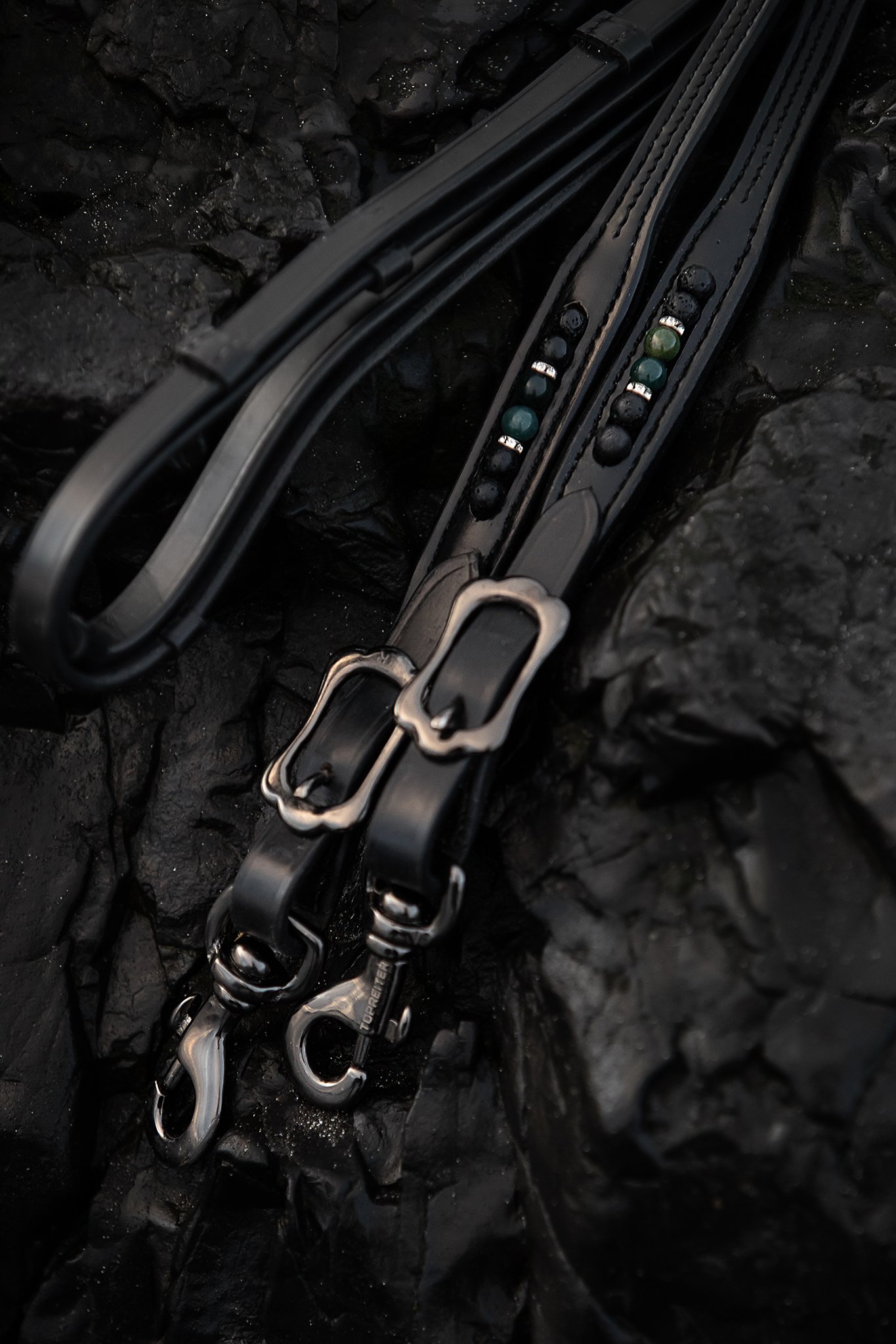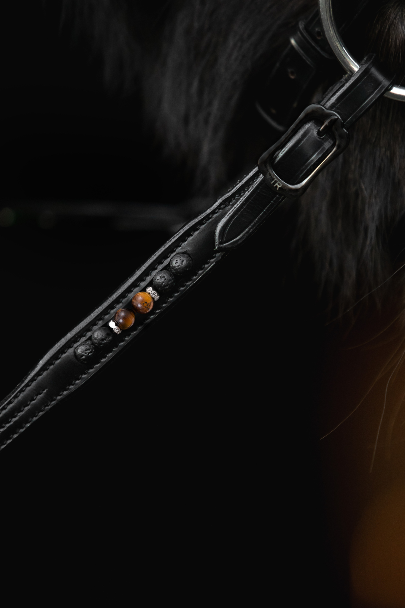 Orka-lädertyglarna med stopp, tillverkade av högkvalitativt djupt svart premiumläder, kombinerar naturliga material med funktionell precision och en distinkt design – perfekt för ryttare som värdesätter kvalitet, ett säkert grepp och en lugn kontakt med sin häst.