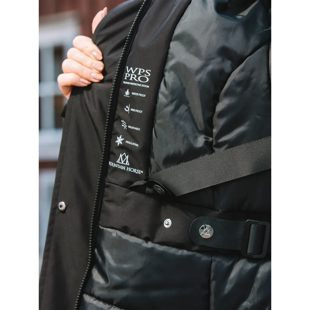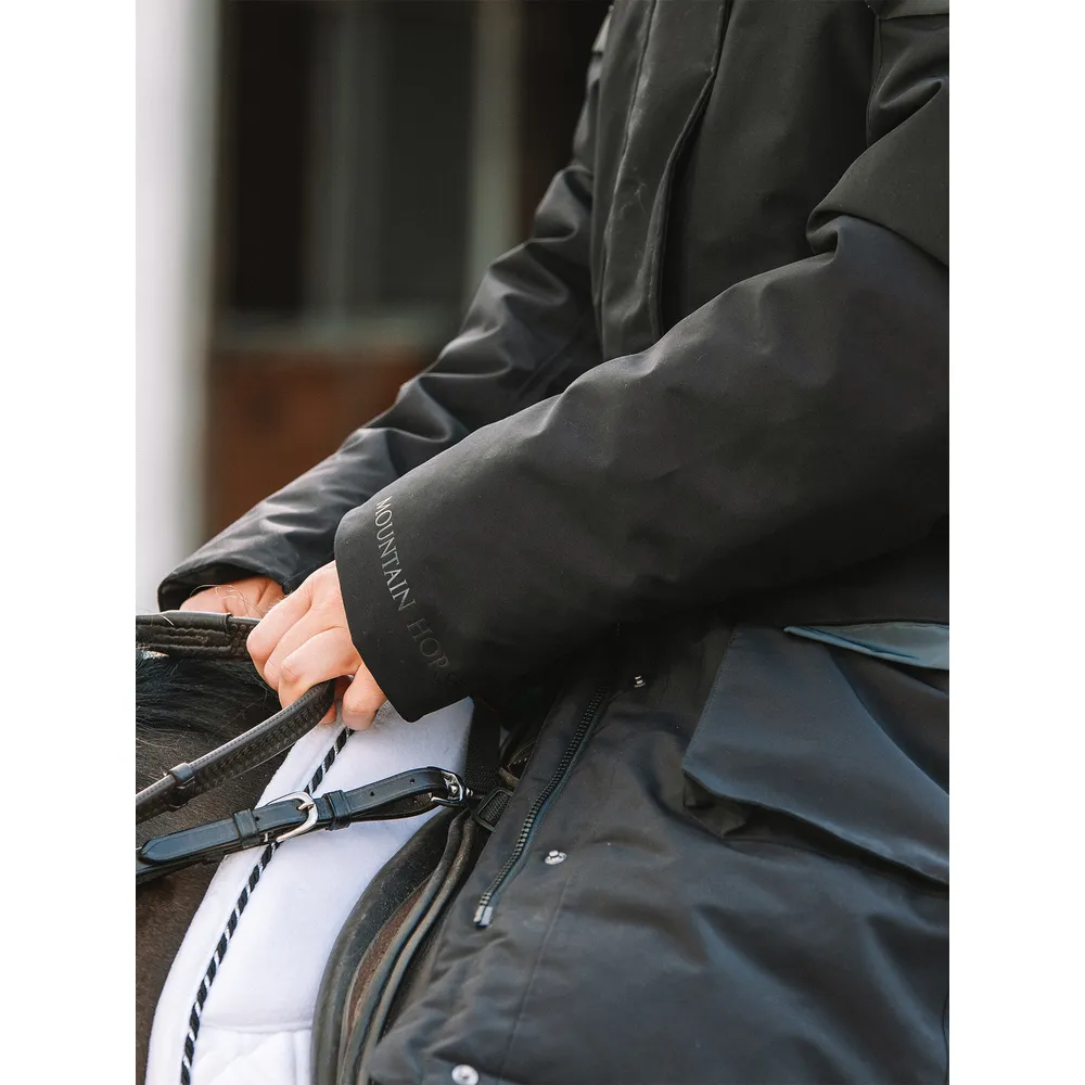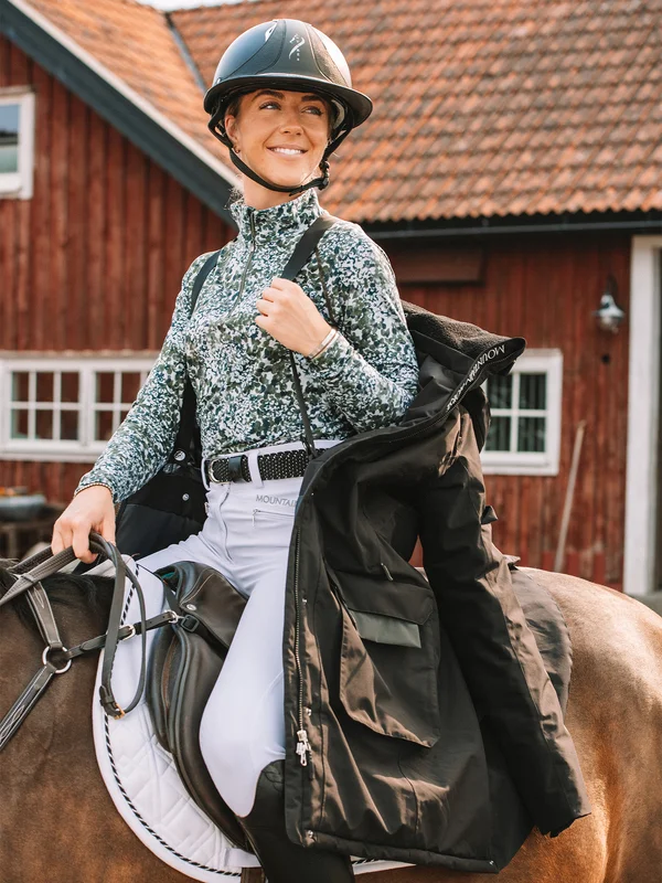 Funktionell, varm, vadderad, vatten- och vindtät, vinterridkappa, stall- och ridkappa. Med reflekterande detaljer, rymliga varma fickor och praktiskt avtagbar huva.